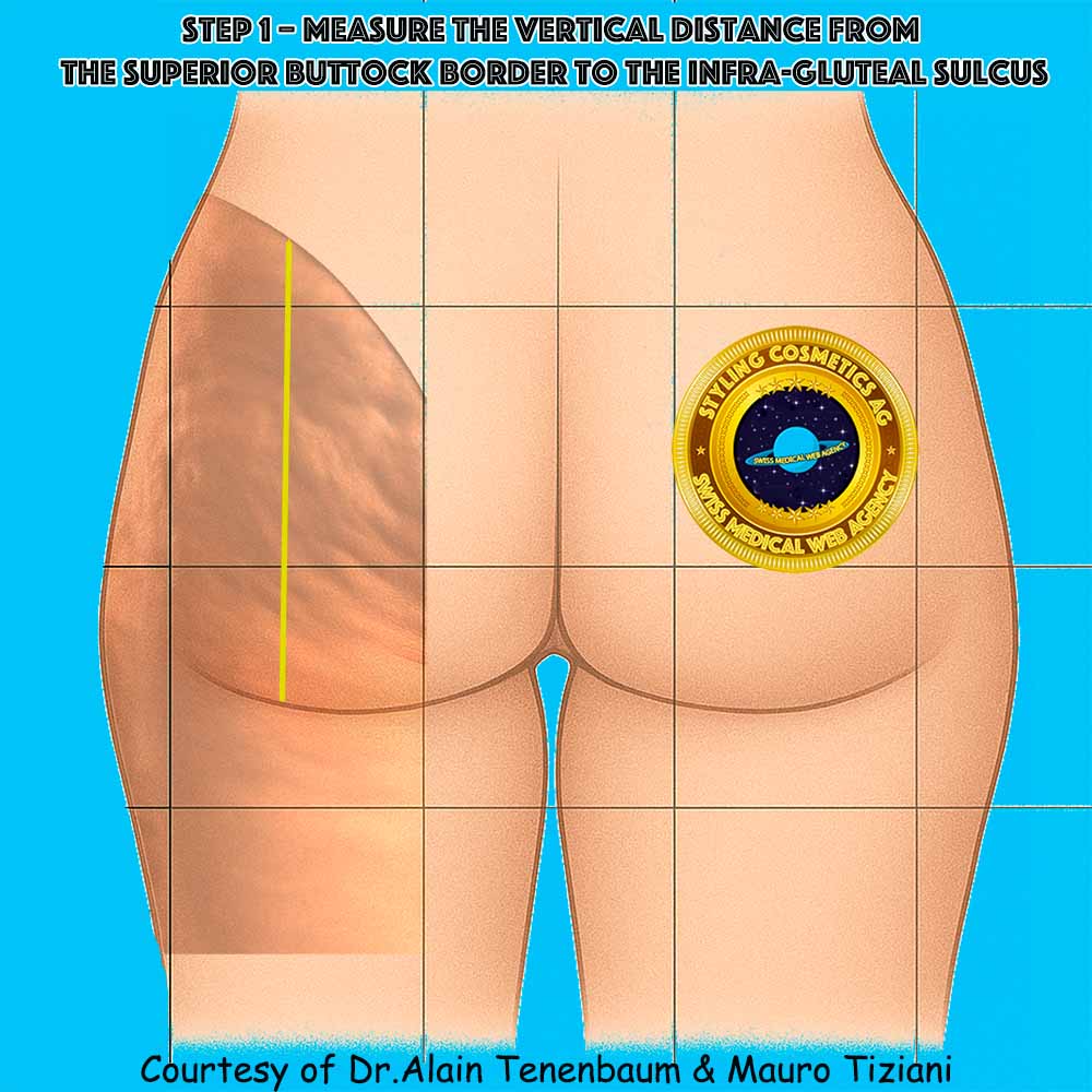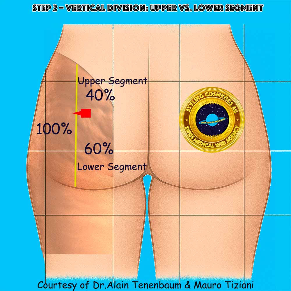 When the vertical height of the buttock is defined as 100%—from the superior border to the infra‑gluteal sulcus—two reproducible segments can be identified. These landmarks help standardize cellulite mapping and guide targeted interventions.