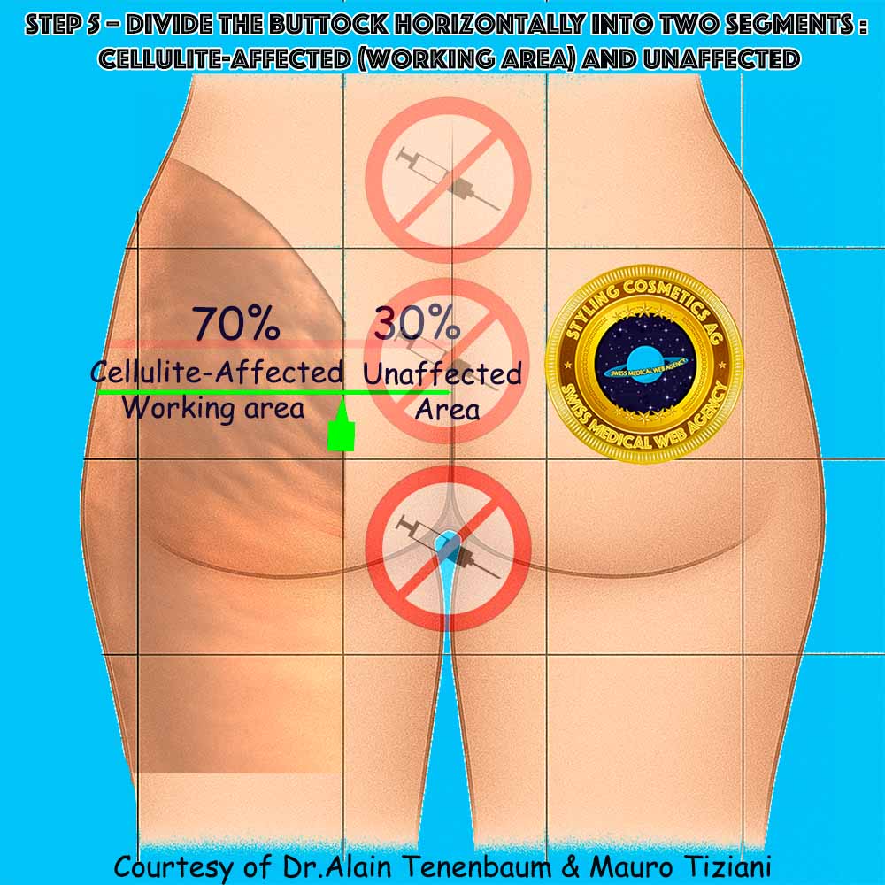 To standardize treatment planning, the cellulite-affected gluteal working area is first identified and then subdivided into a reproducible grid.